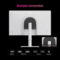 Elegantiška balta spalva suteikia šiuolaikišką ir švarų dizainą, puikiai tinkantį minimalistinėms žaidimų vietoms, profesionalioms darbo erdvėms ar stilingiems namų biurams. Monitorius turi 2 × HDMI 2.1 ir DisplayPort 1.4 jungtis, kurios leidžia naudoti 1440p raišką su 320 Hz dažniu. Jis puikiai suderinamas su aukštos klasės žaidimų kompiuteriais, PlayStation 5, Xbox Series X ir žaidimų nešiojamaisiais kompiuteriais. Papildomos USB 2.0 ir ausinių jungtys leidžia patogiai prijungti periferinius įrenginius.